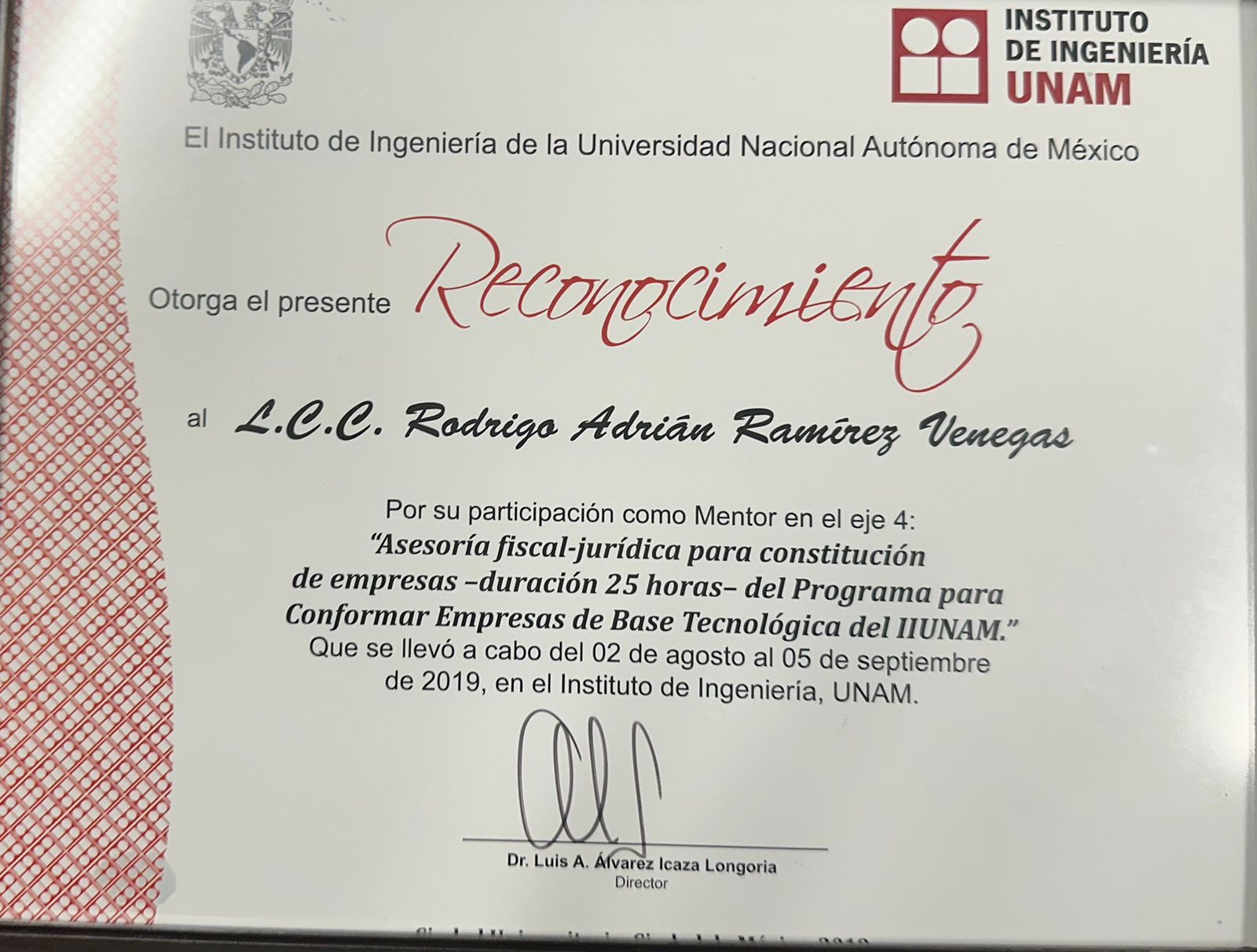 He tenido la oportunidad de ser mentor de proyectos de incubación en el Instituto de Ingeniería de la UNAM, una experiencia que me ha permitido apoyar a emprendedores, en el desarrollo y consolidación de sus ideas innovadoras.